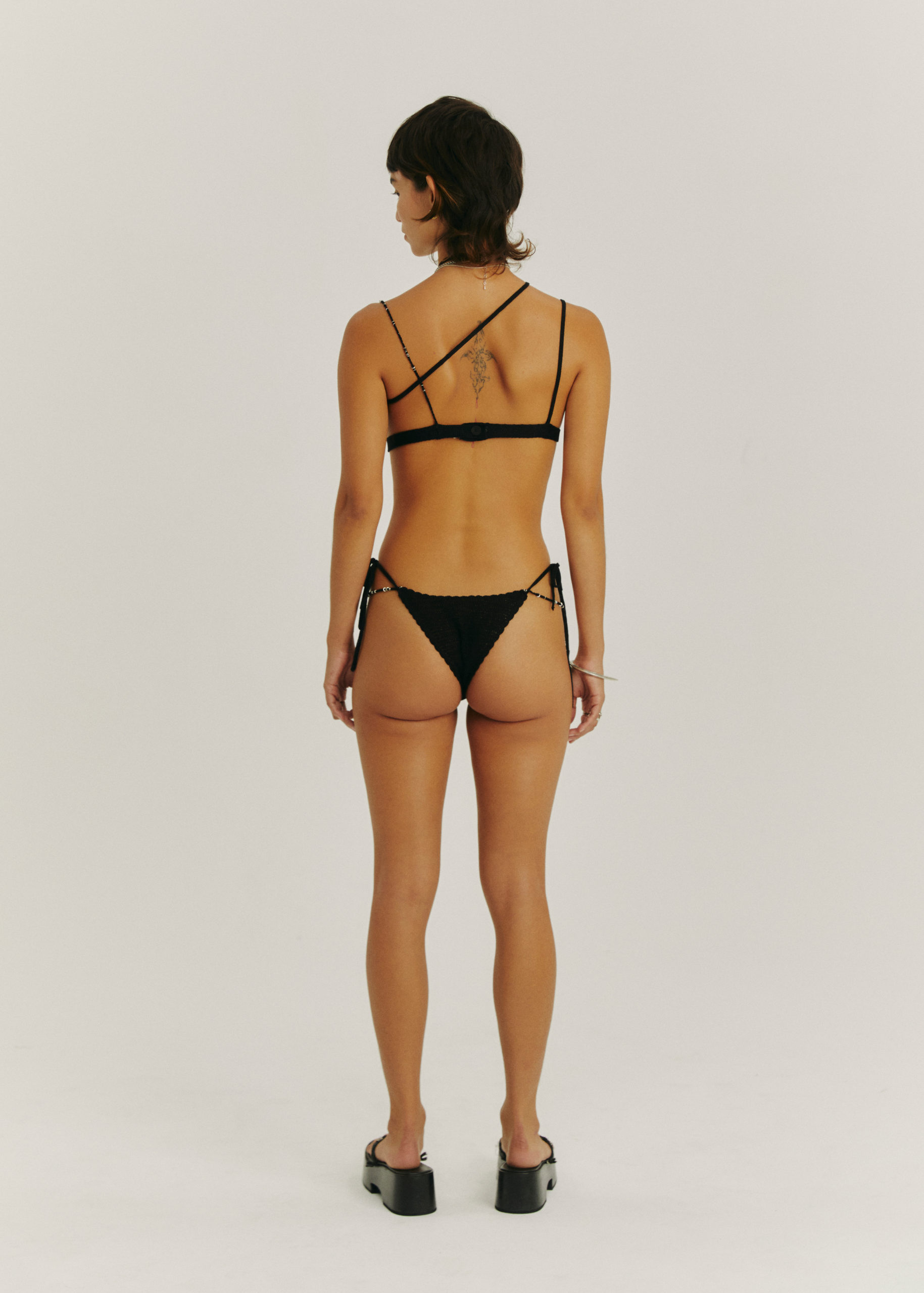 ASYMMETRIC BIKINI TOP, STRAP TIE BOTTOM WITH BRASS CHARM DETAIL.