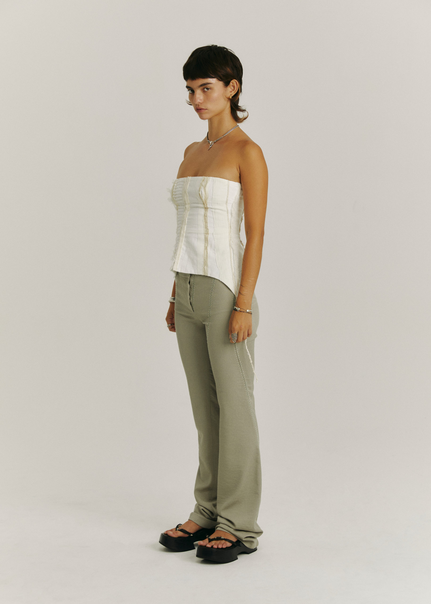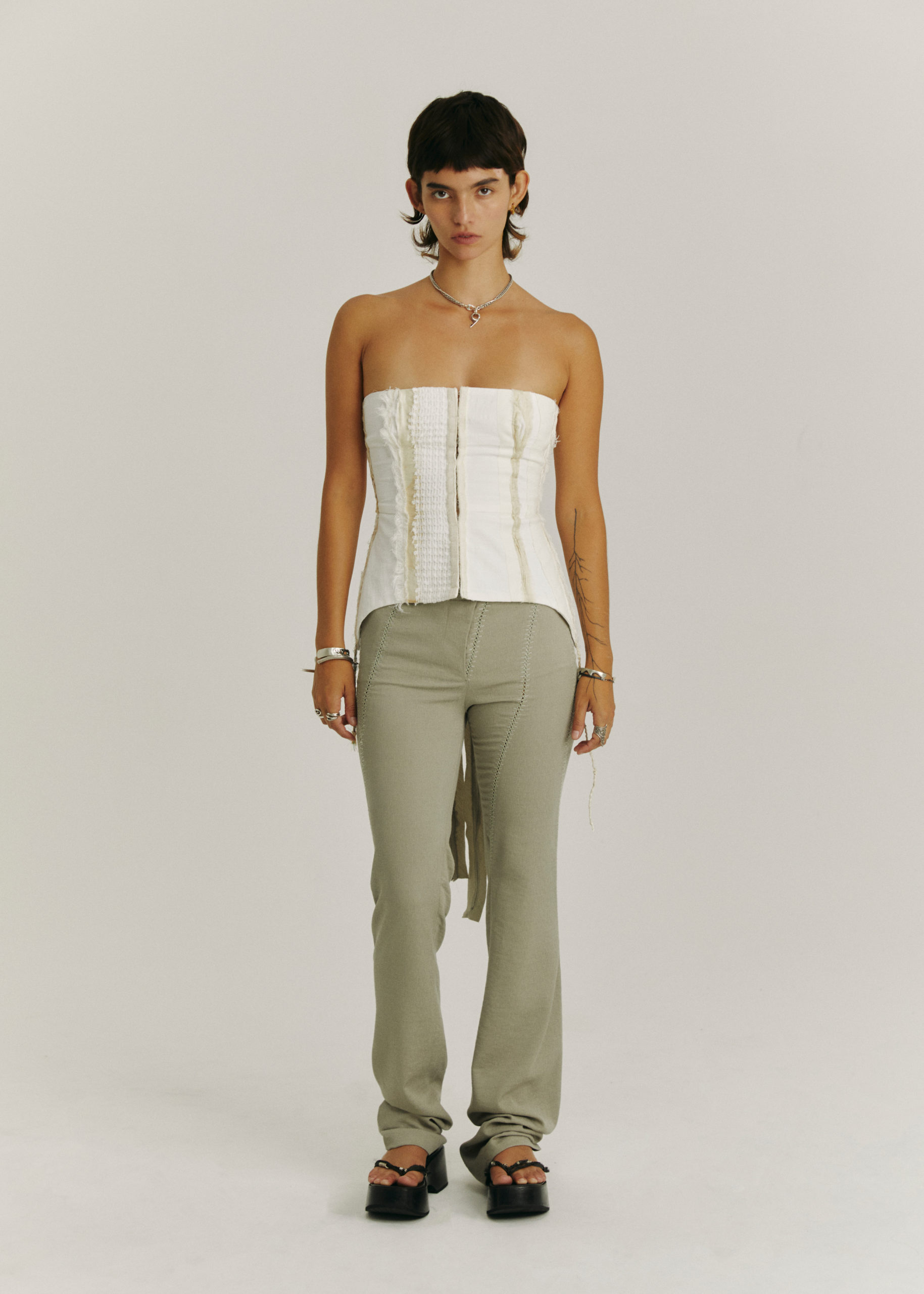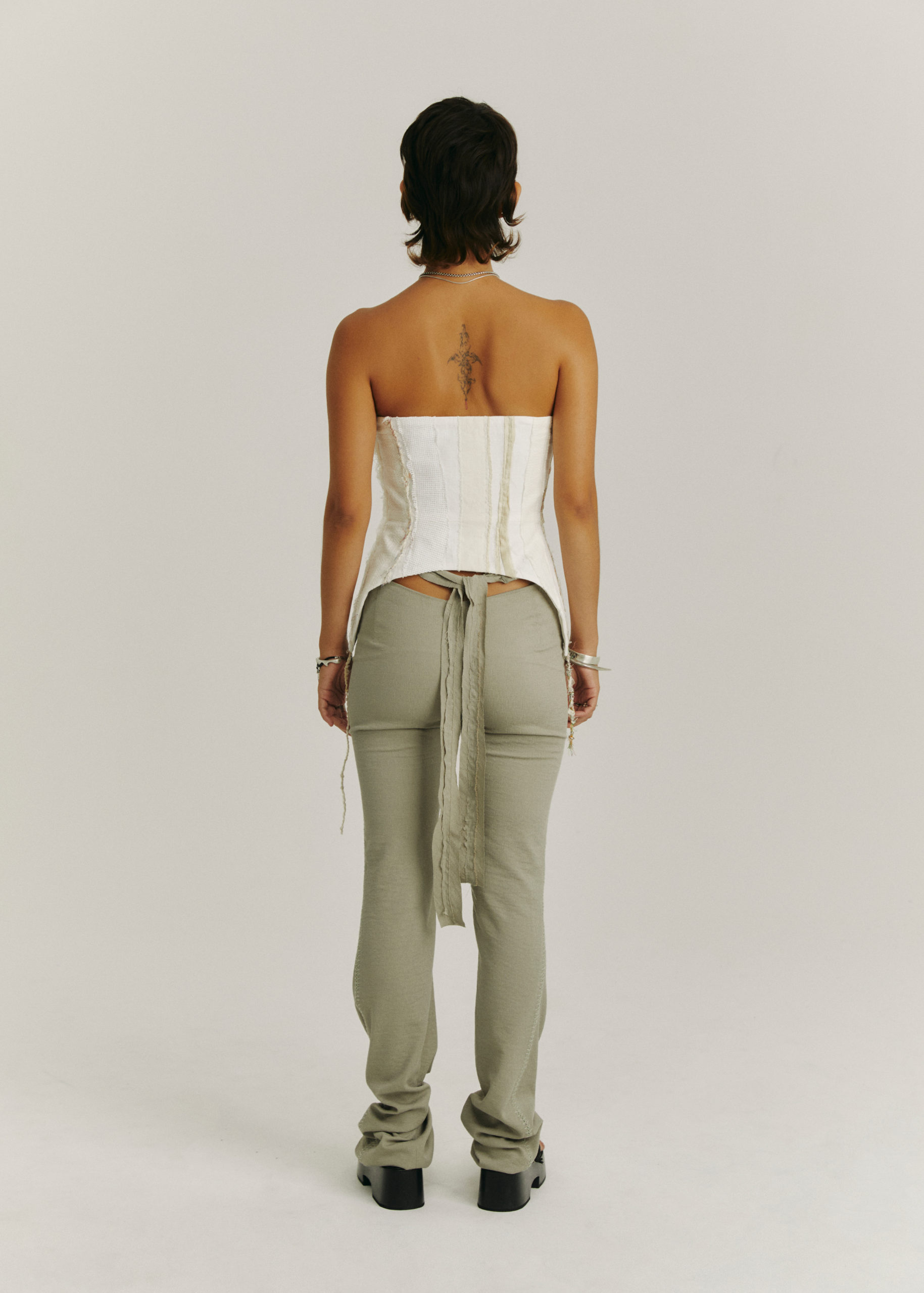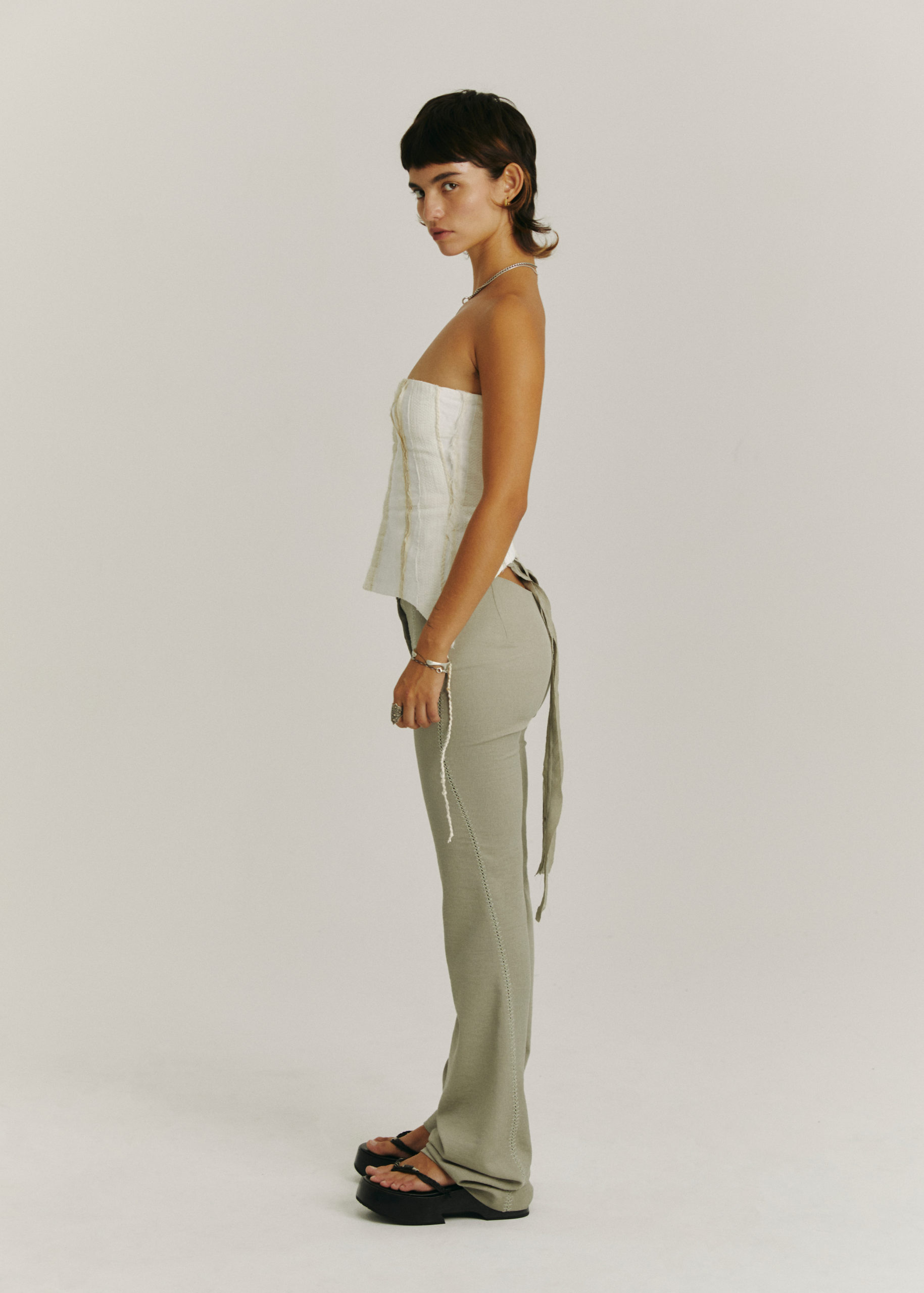 CROSS STITCH EMBROIDERY DETAIL THROUGHOUT, STRAP TIE AT BACK.