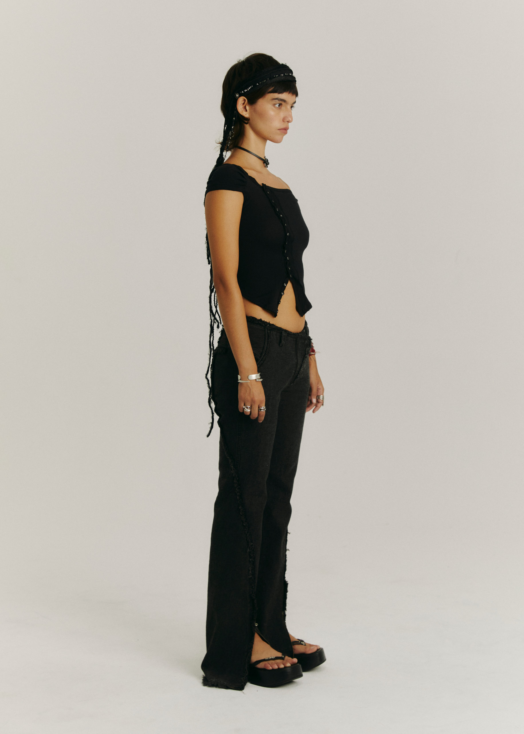 ADJUSTABLE BUTTON CLOSURE, EMBROIDERY DETAIL AT SIDE AND BACK, ASYMMETRIC WAIST LINE.
