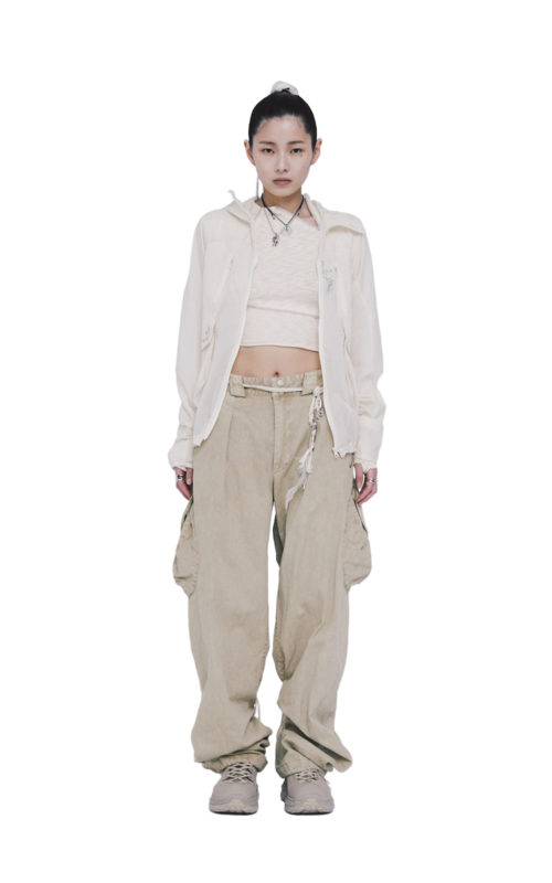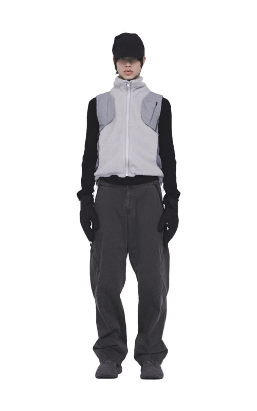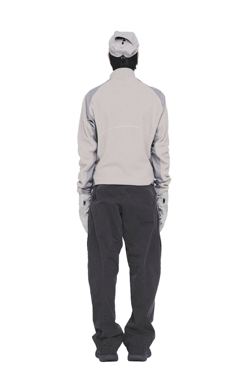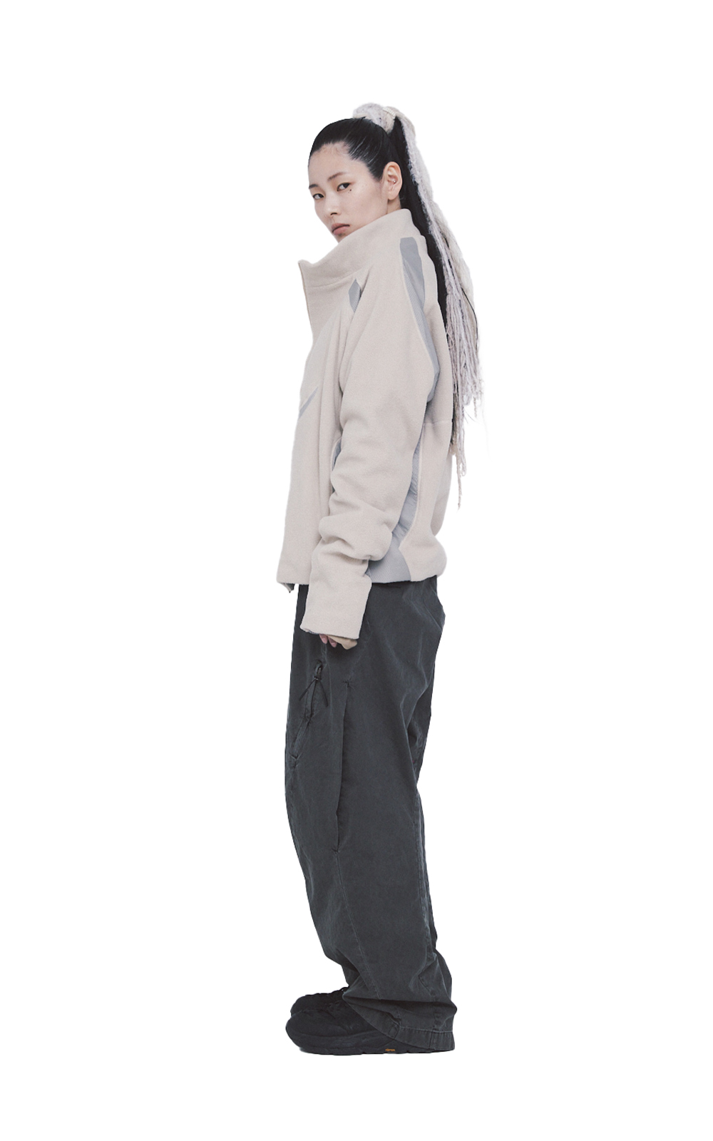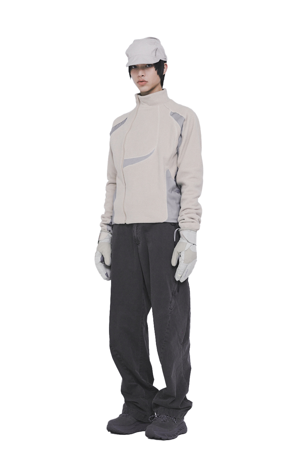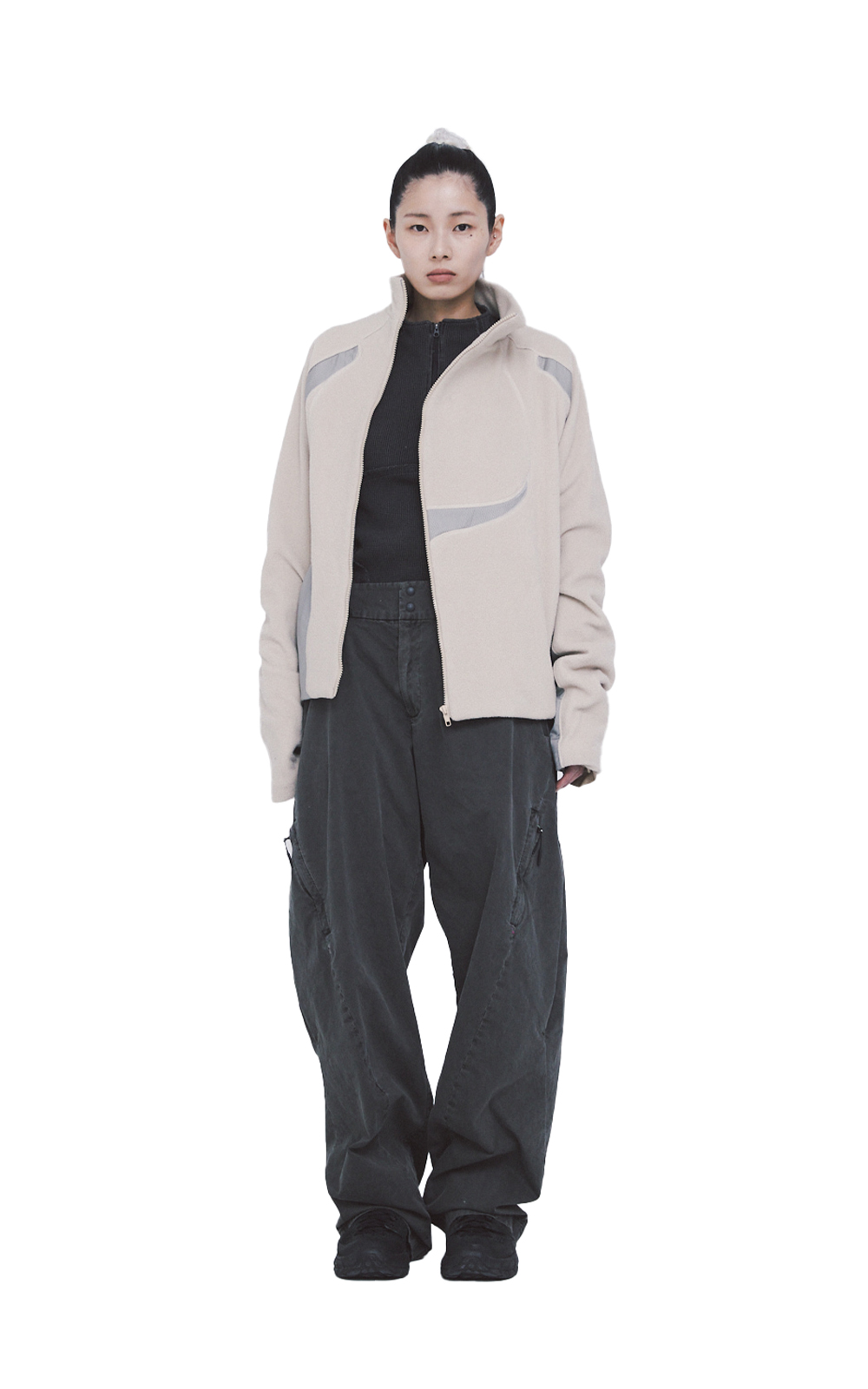 CONTRAST PANEL DETAIL WITH SIDE POCKETS AND ASYMMETRIC FRONT ZIPPER.
