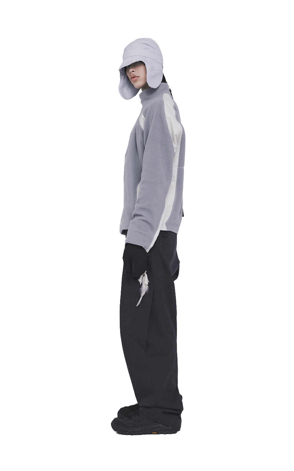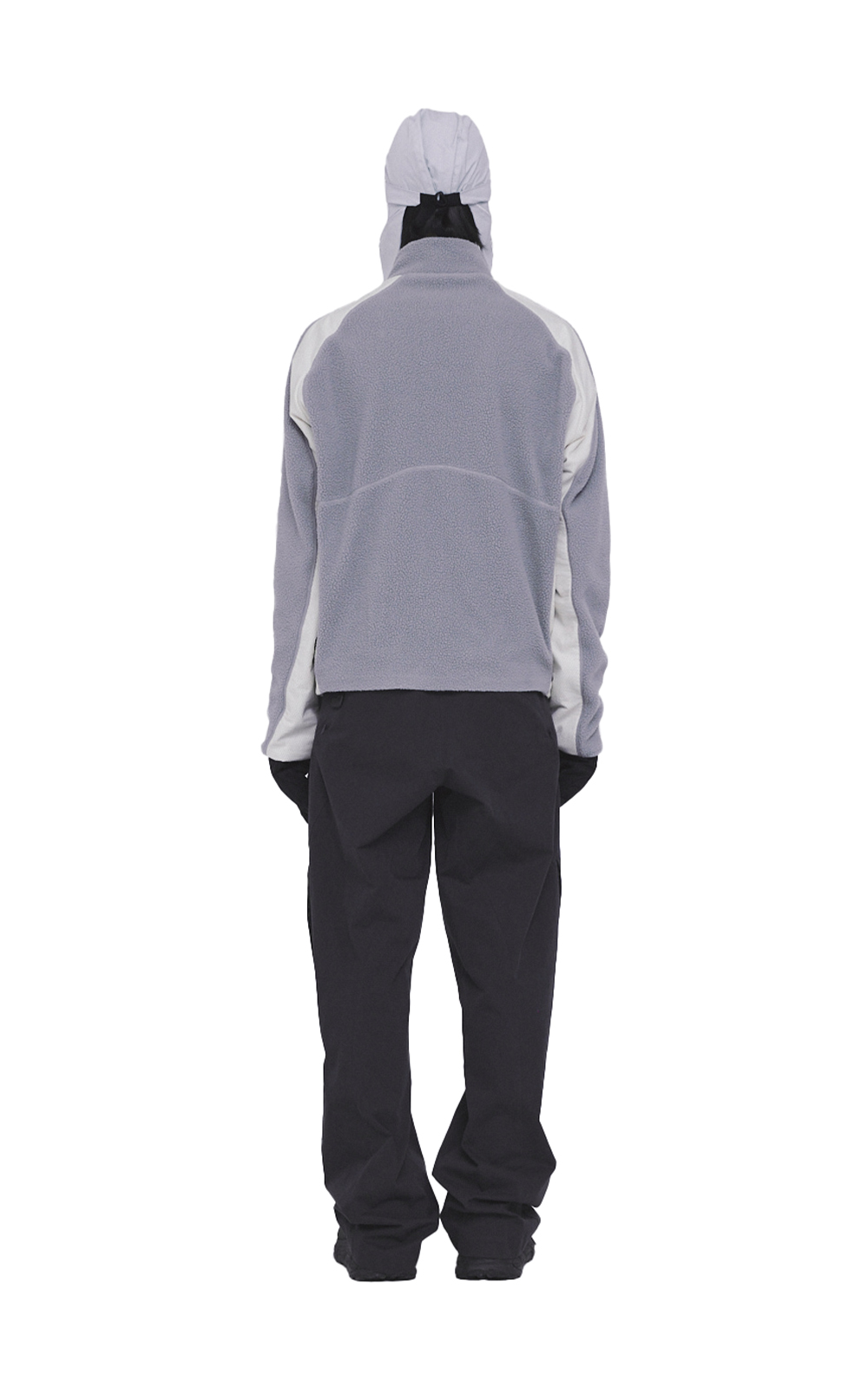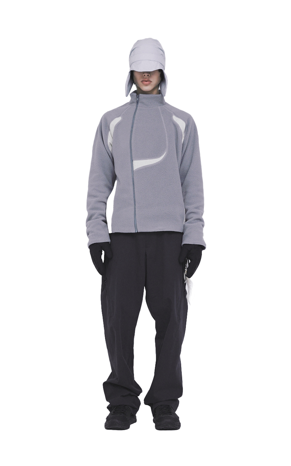 CONTRAST PANEL DETAIL WITH SIDE POCKETS AND ASYMMETRIC FRONT ZIPPER.