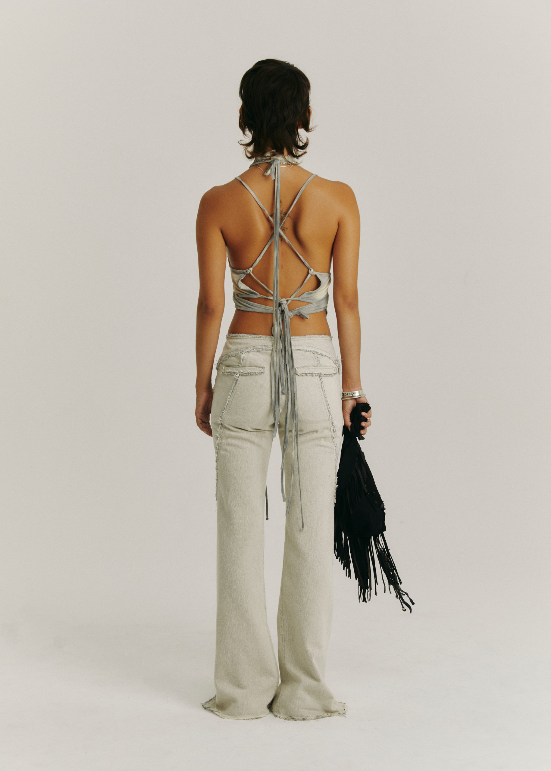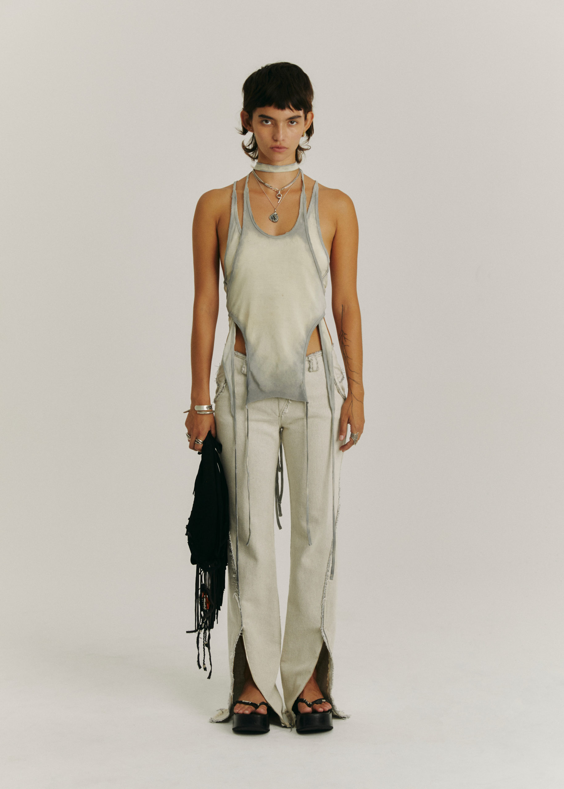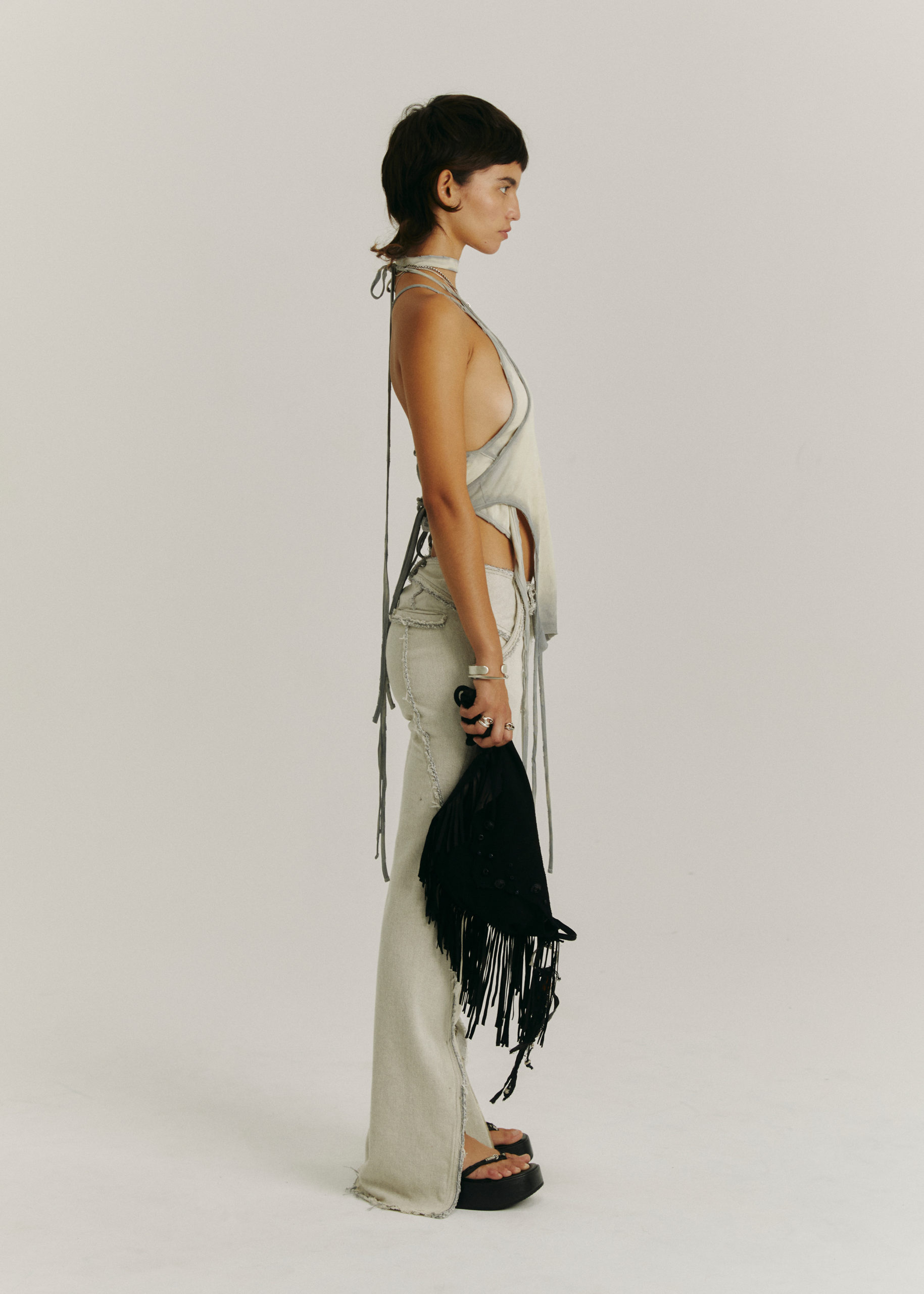 ADJUSTABLE STRAP, BEAD AND BRASS CHARM DETAIL THROUGHOUT.