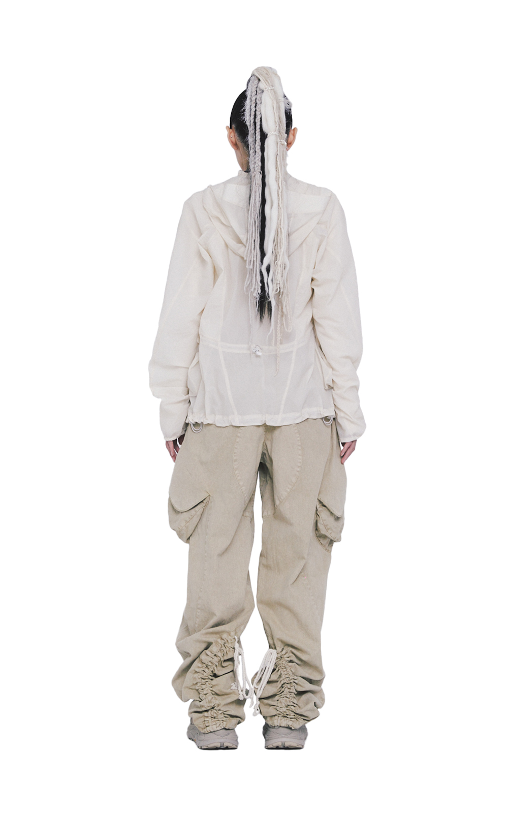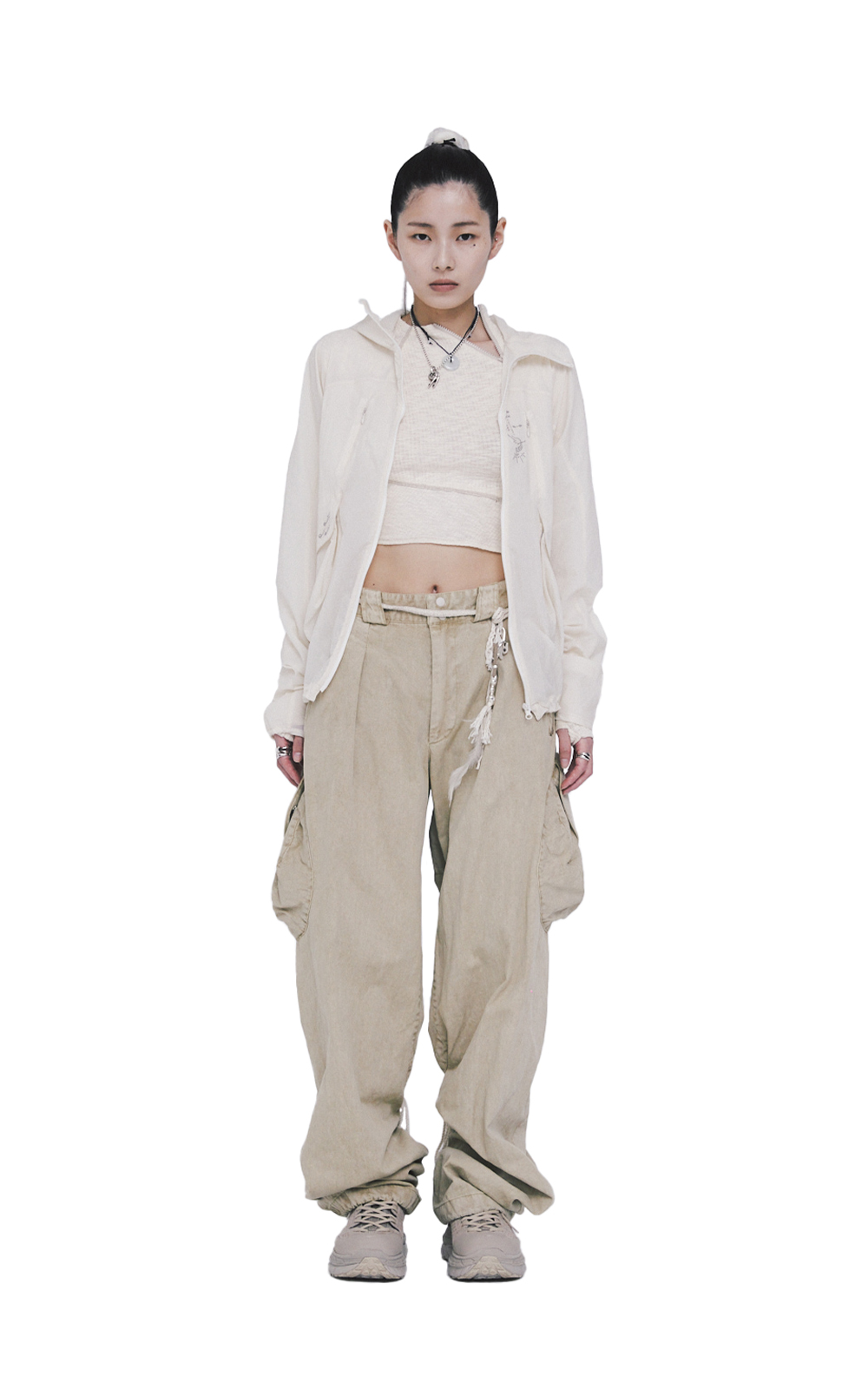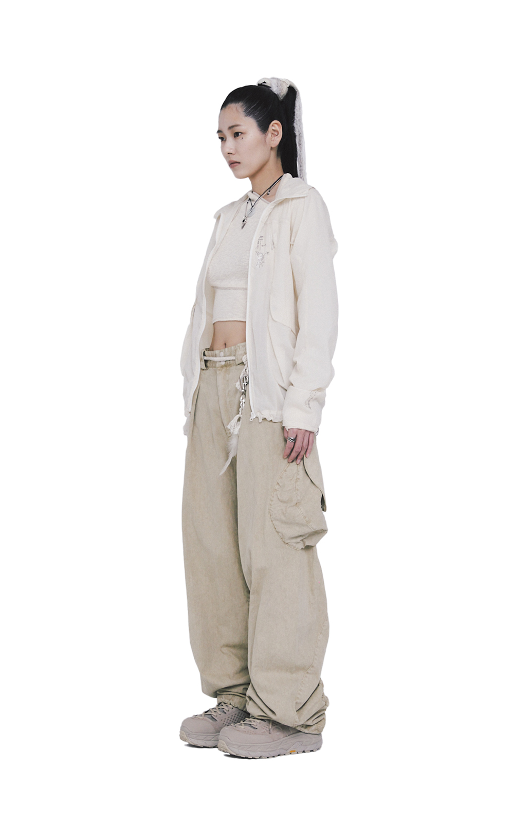 LIGHTWEIGHT, SCREENPRINT DETAIL, FRONT FLAP ADJUSTABLE POUCH STYLE POCKETS, ZIPCORD ADJUSTABLE WAIST, ZIPCORD ADJUSTABLE BACK.