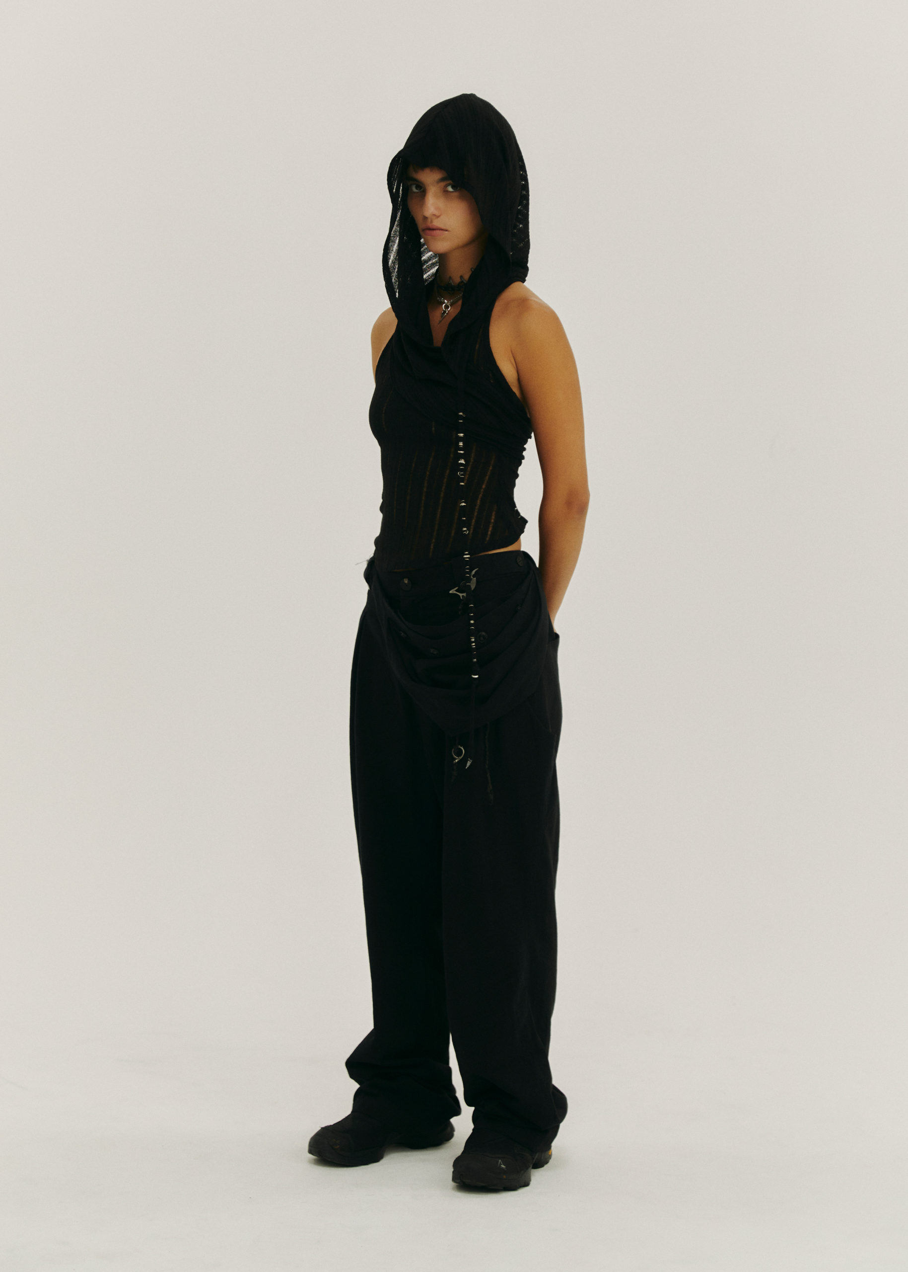 DRAPED HOODIE, ADJUSTABLE HALTER STRAPS, BRASS CHARM DETAIL STRAP