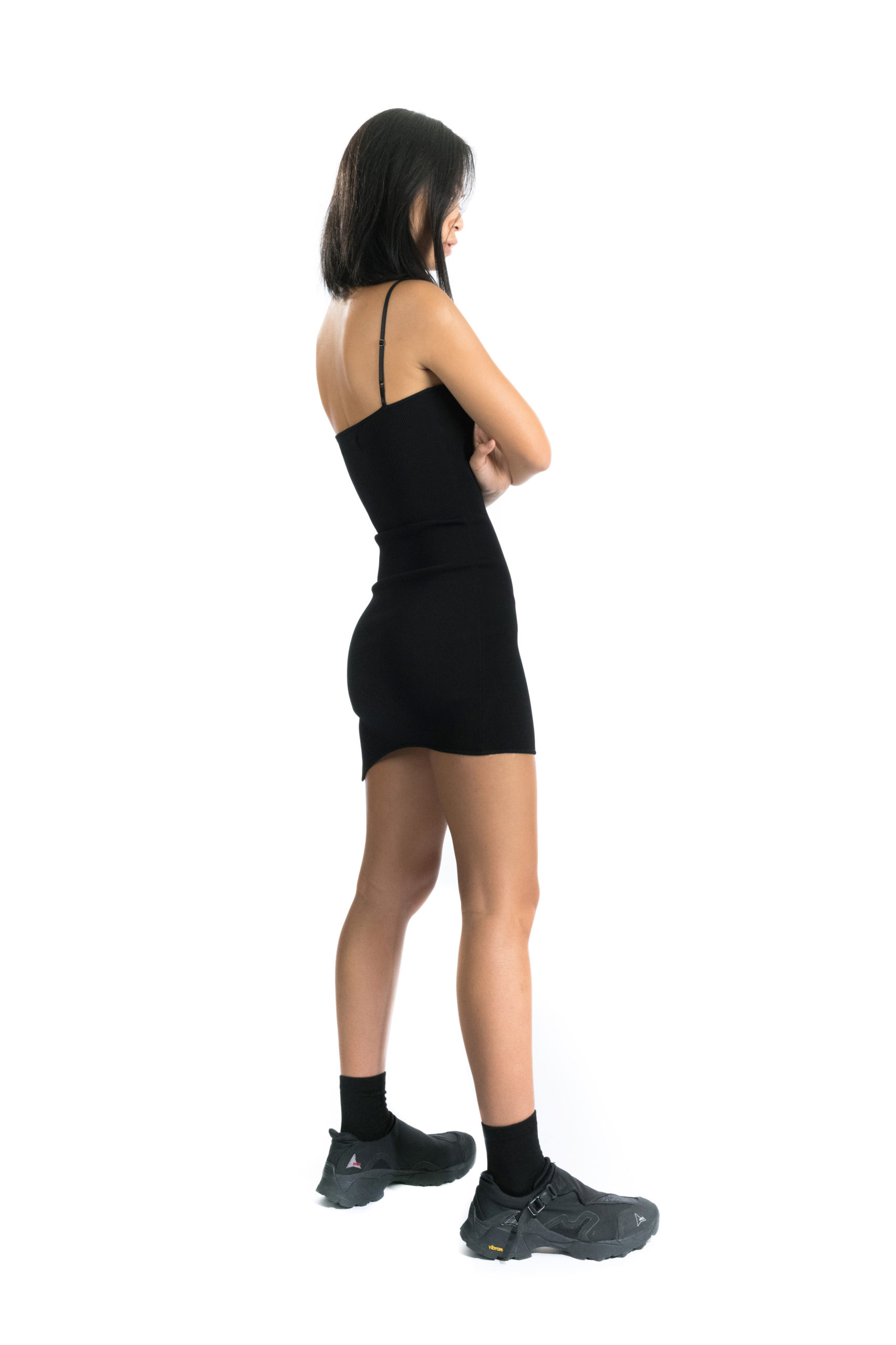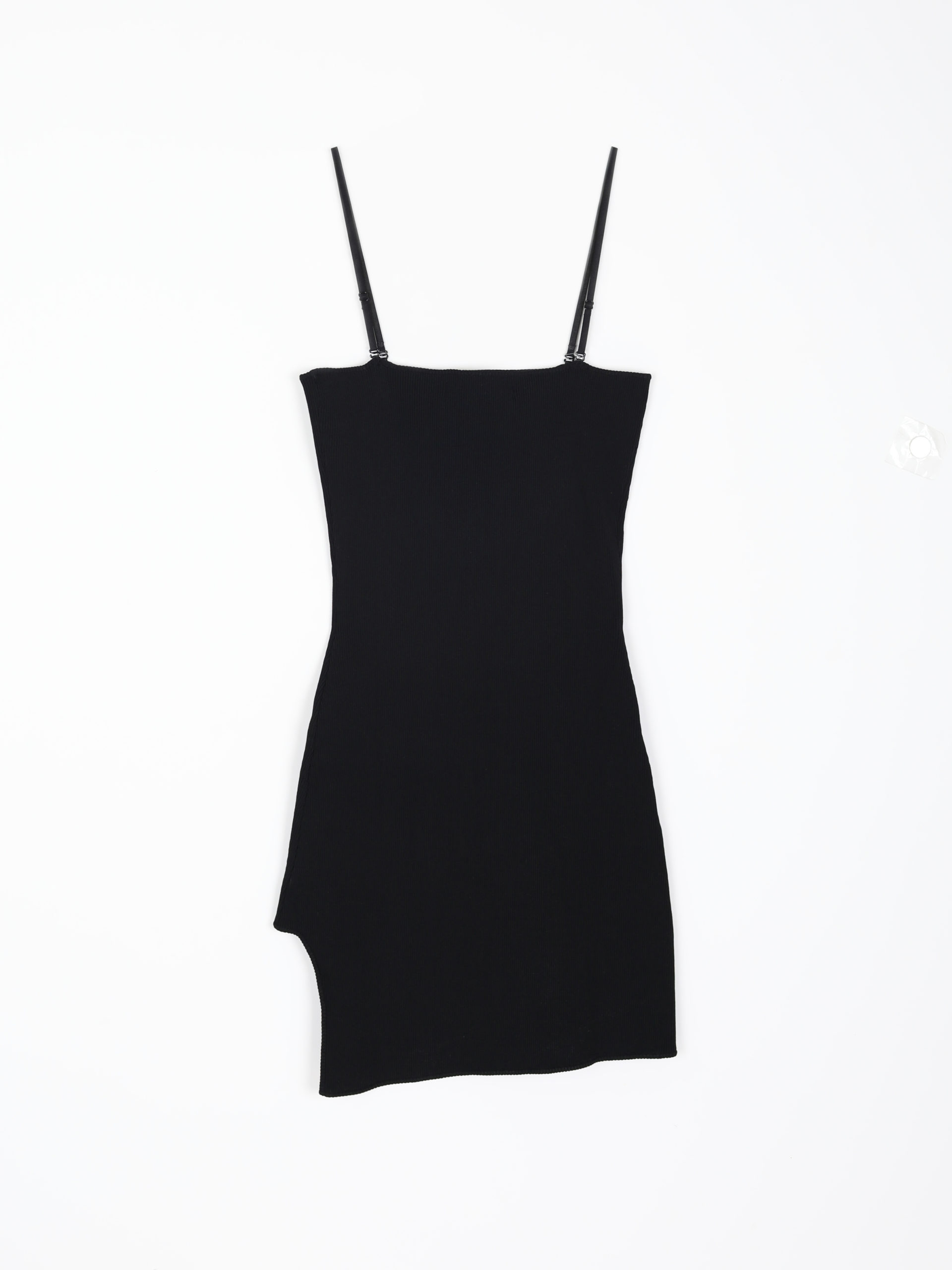 Knit mini dress with asymmetric hem and adjustable shoulder straps.