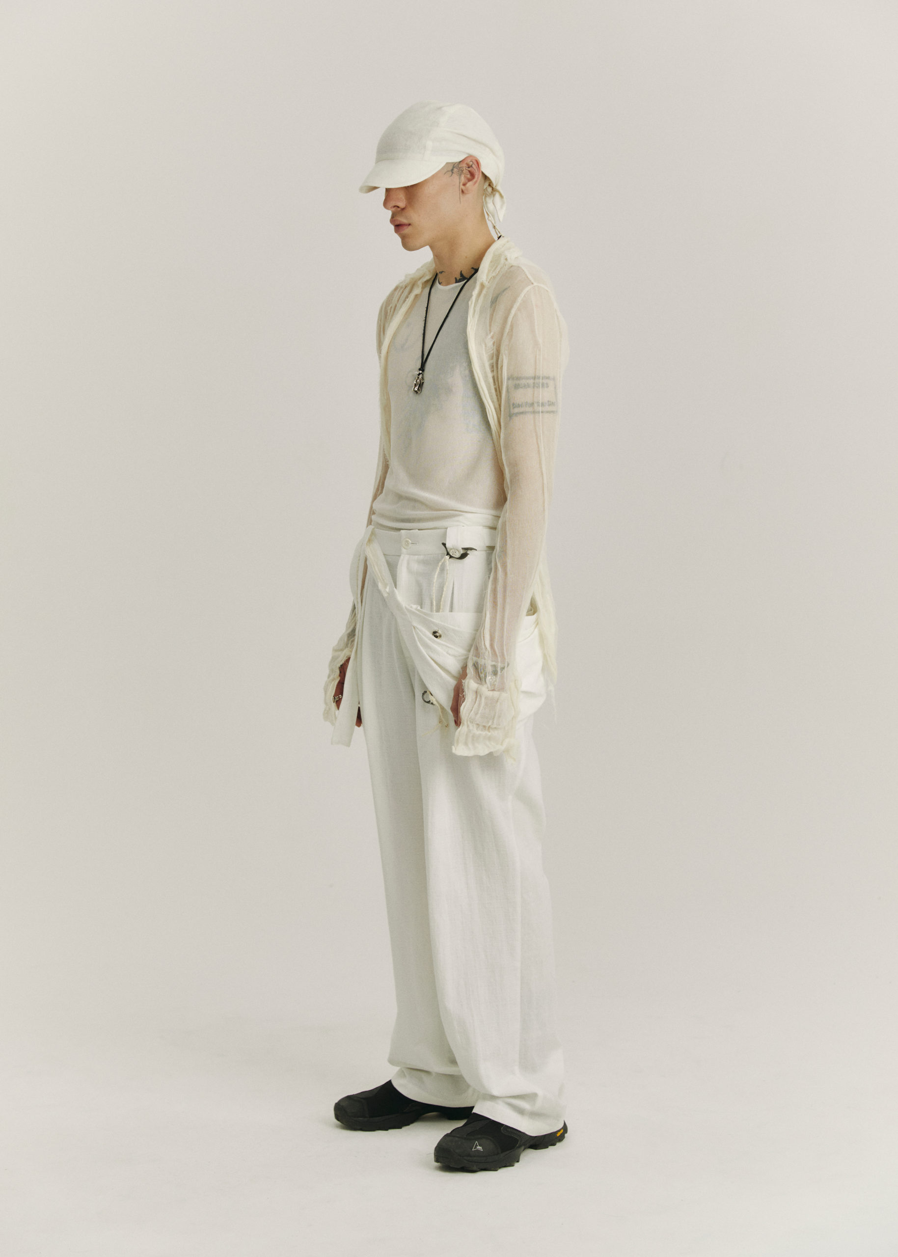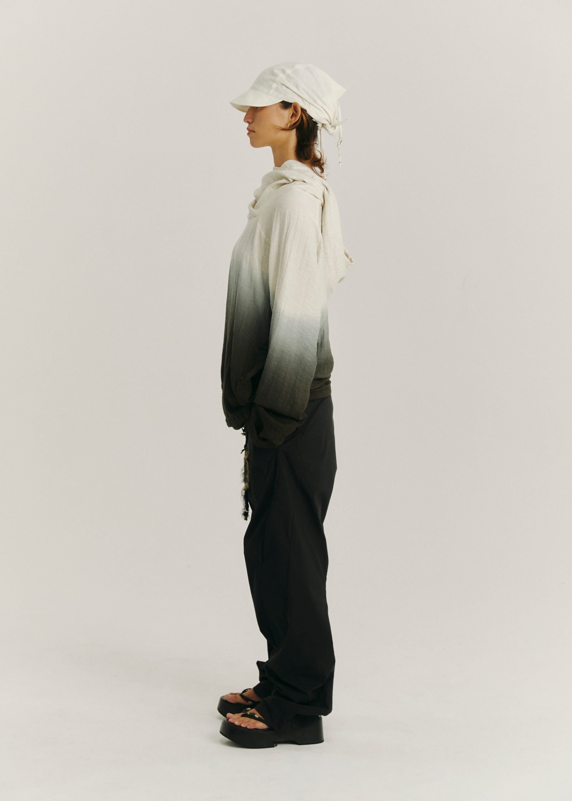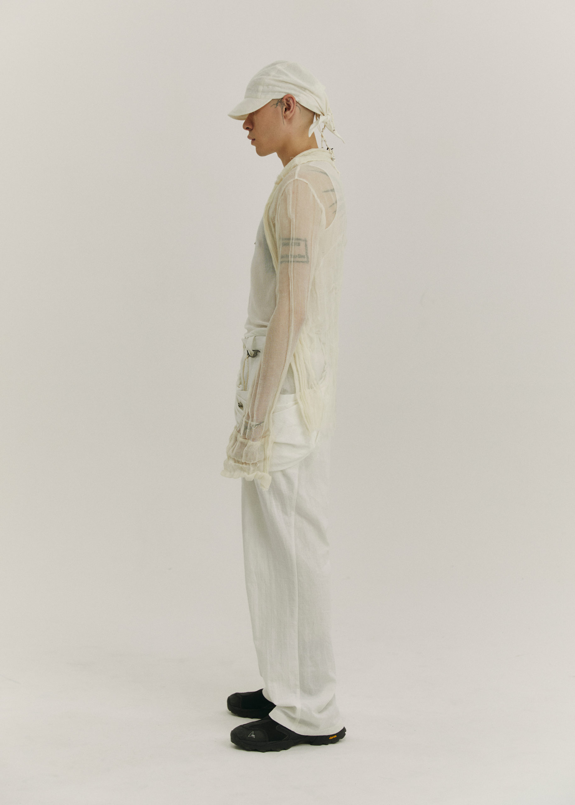 CAP WITH KNOT TIE AND BRASS CHARM AT BACK.
