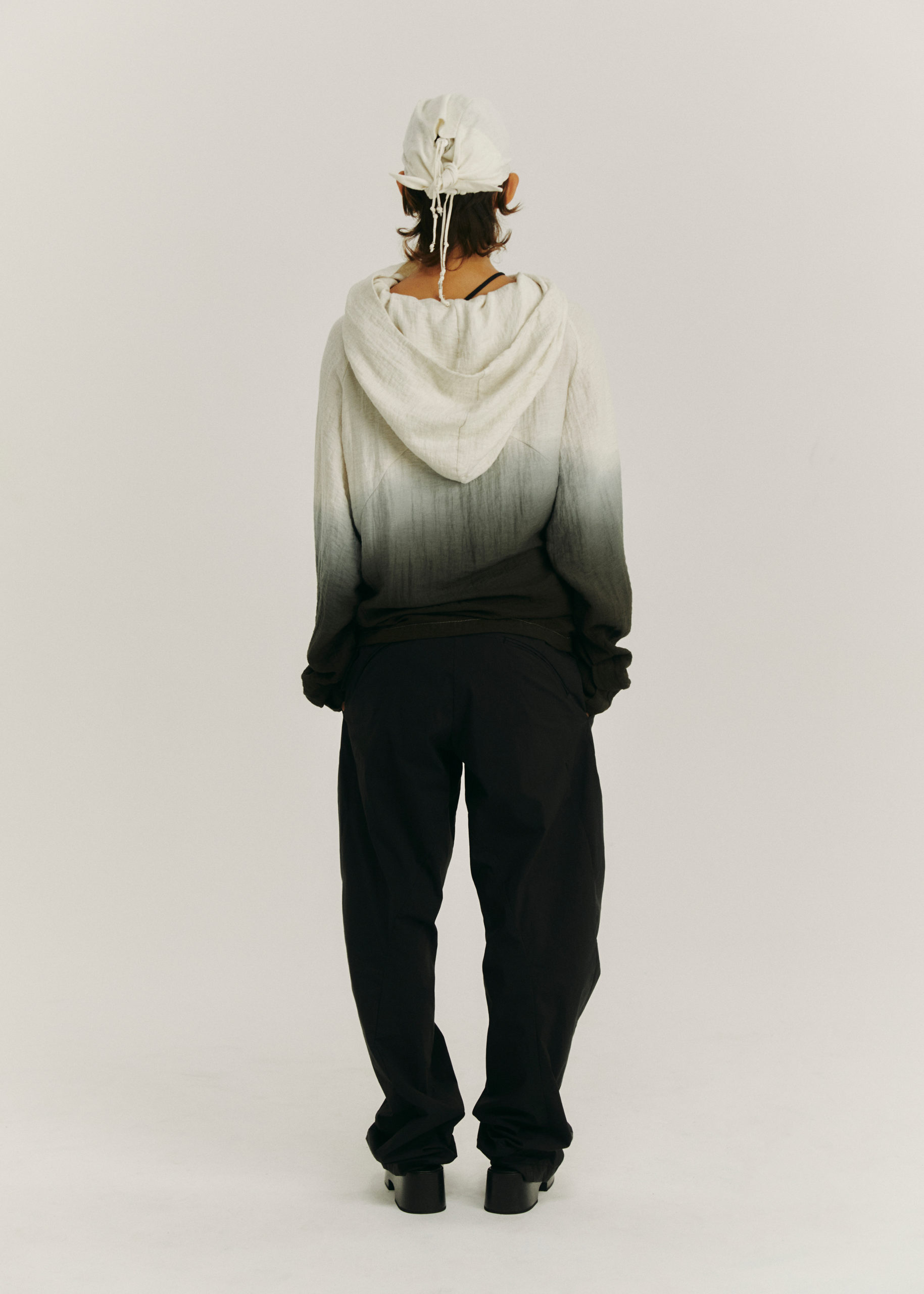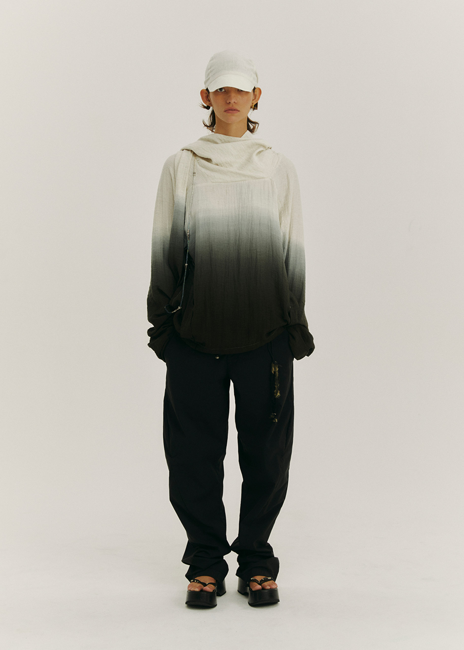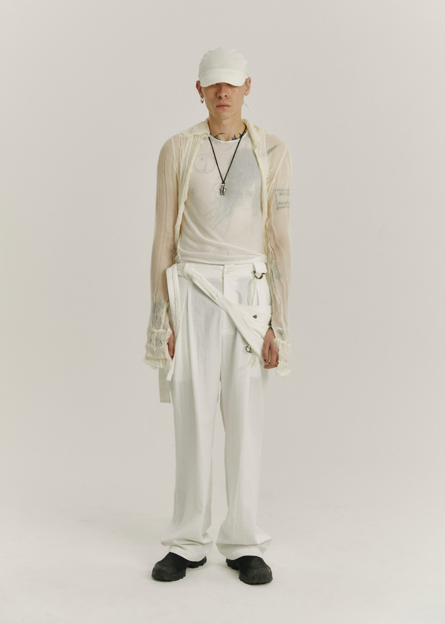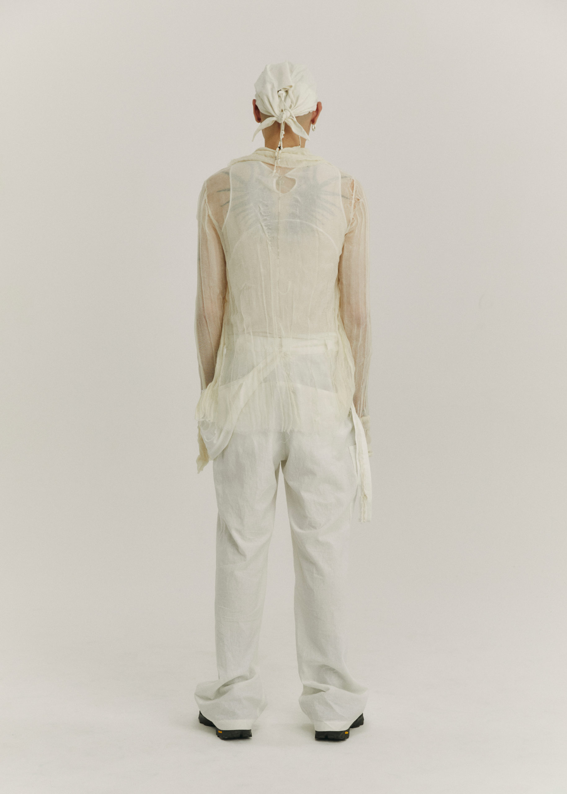 CAP WITH KNOT TIE AND BRASS CHARM AT BACK.