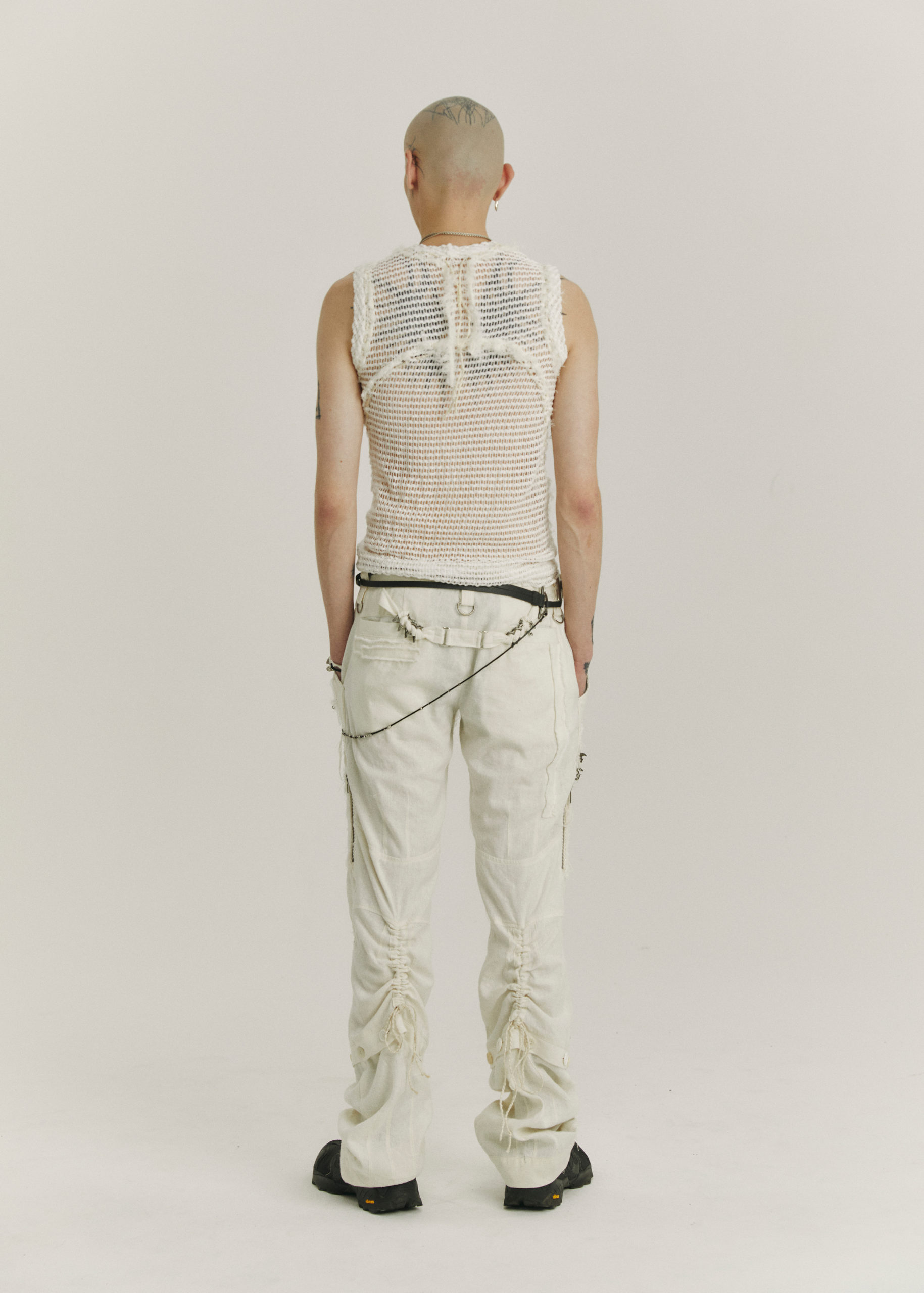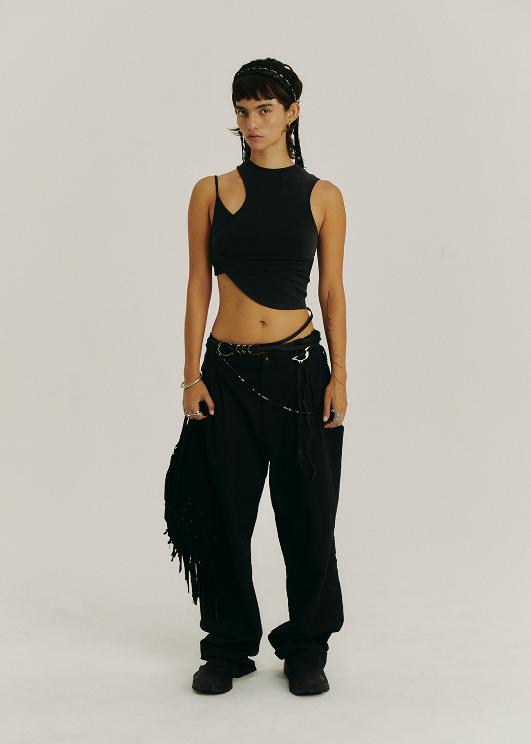 LAYERED BELT WITH PLATED BRASS CHAIN DETAIL.
