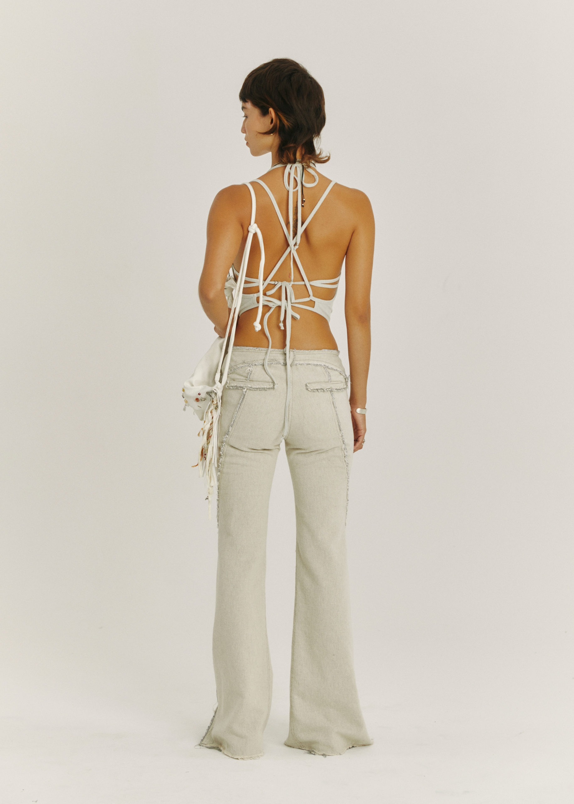 RAW EDGE HEM, LOW WAIST, ZIPPER AT HEM FOR BOOTCUT.