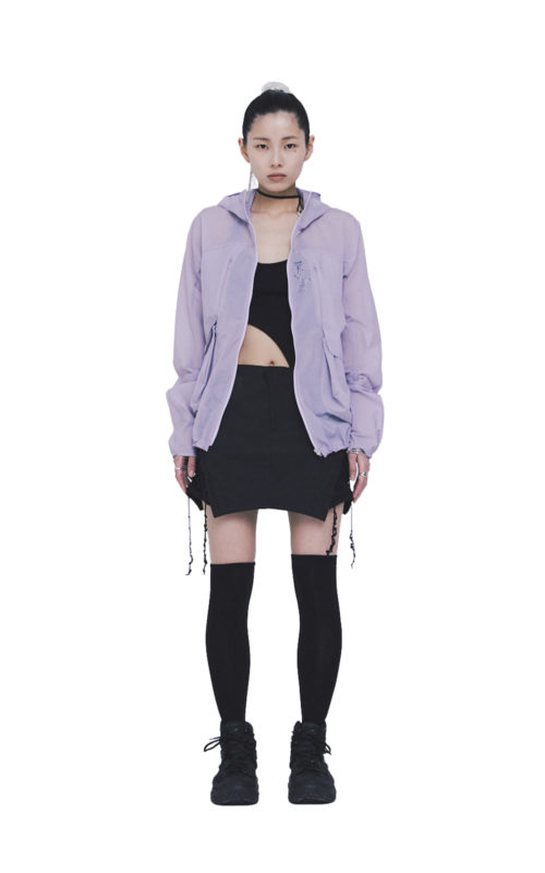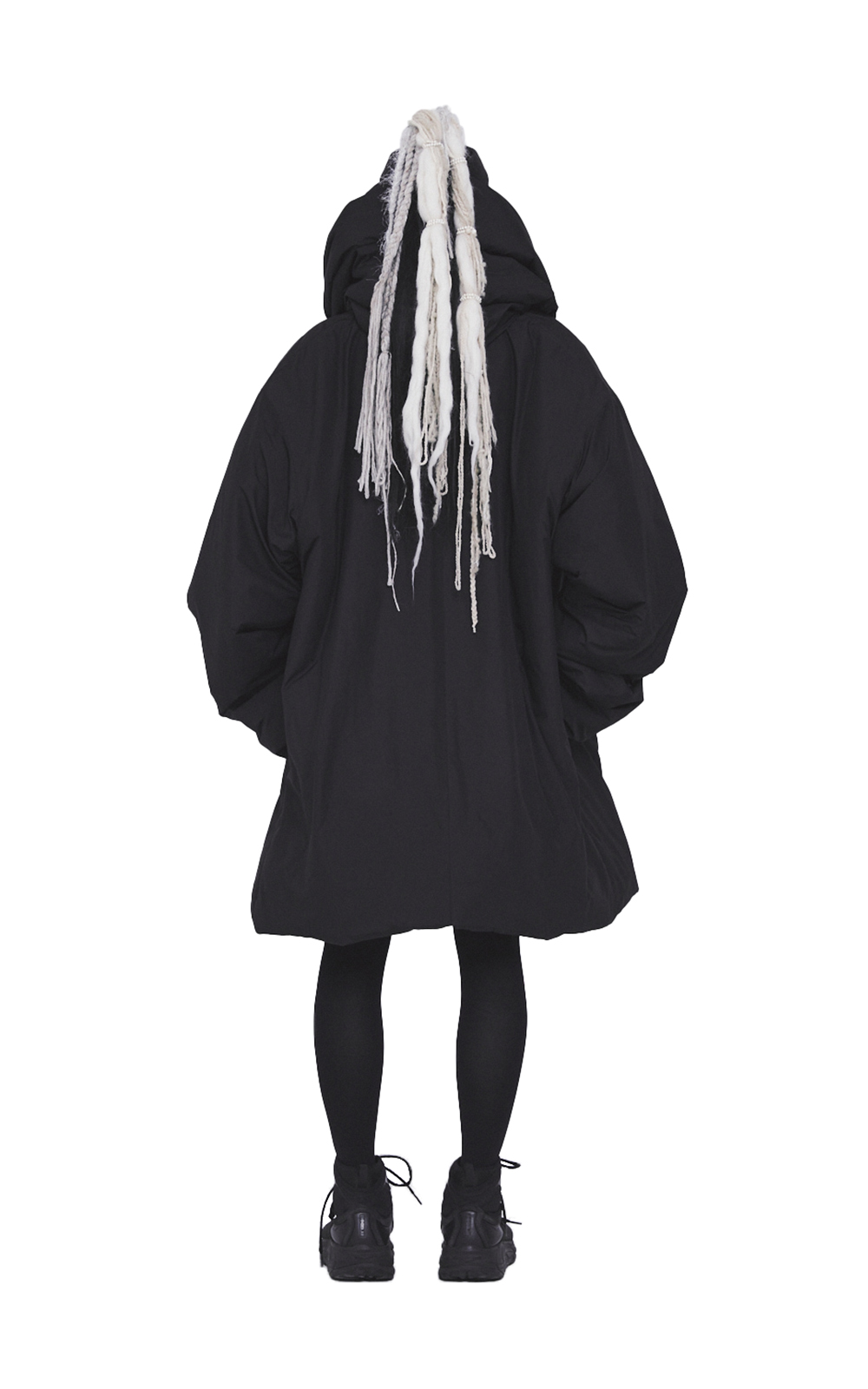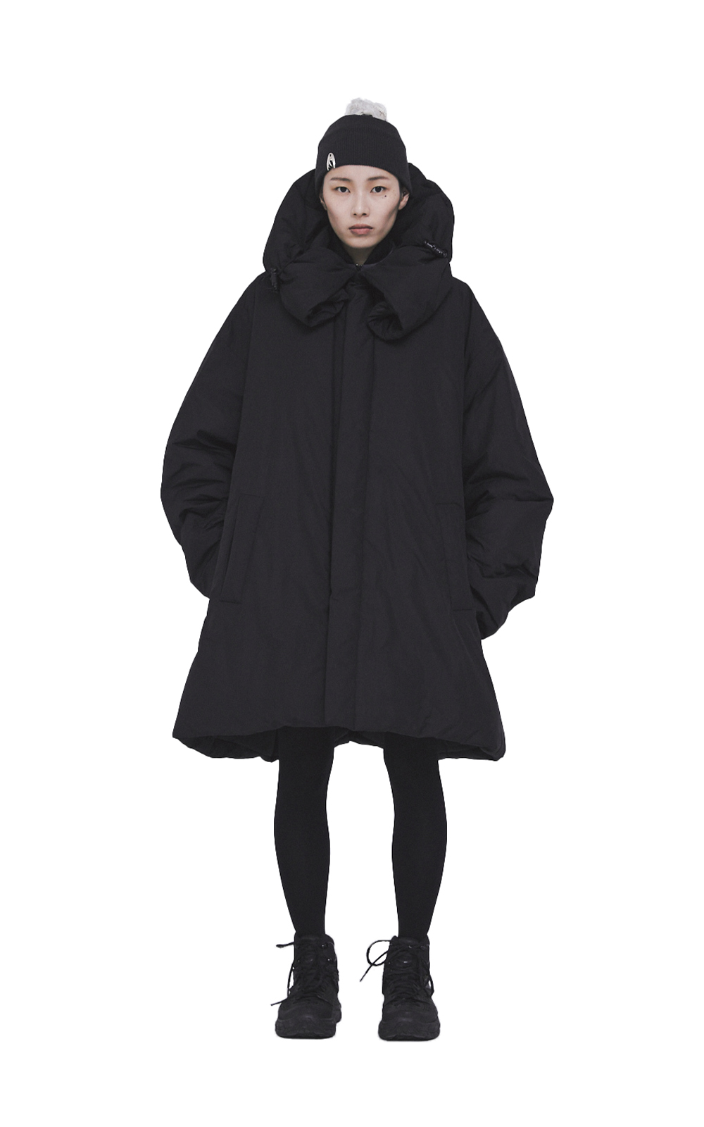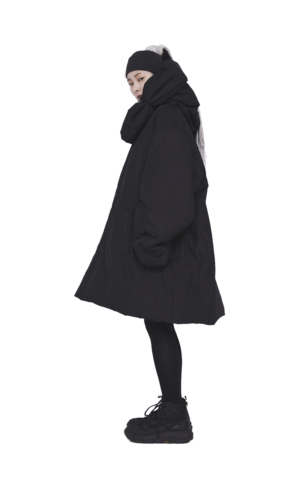 HOOD CAN BE WORN OVERSIZED OR WRAPPED AND STYLED.