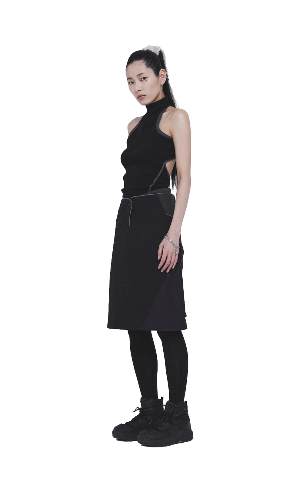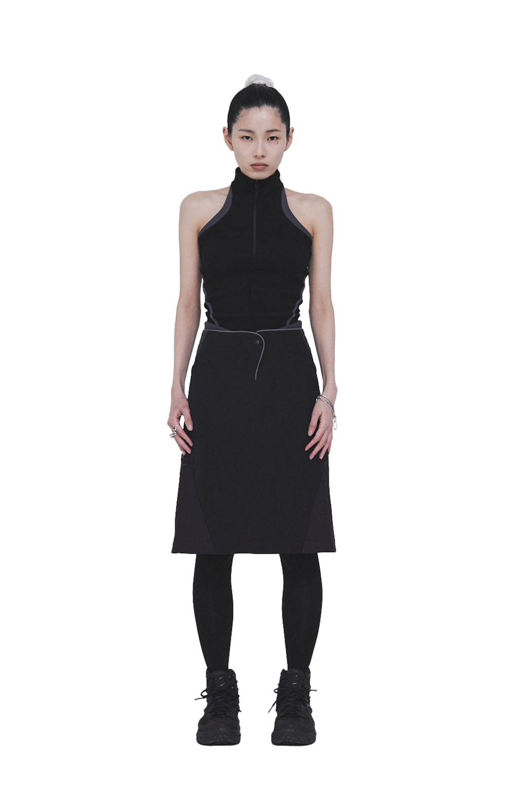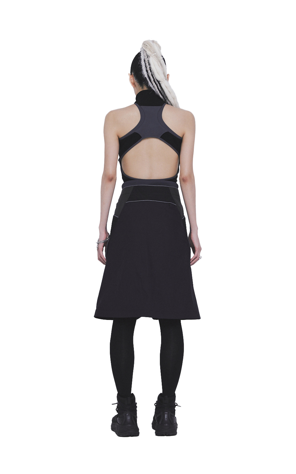 CONSTRAST PANELING, ZIPPERED POCKETS THROUGHOUT, SIDE BUTTON FLAP POCKETS.
