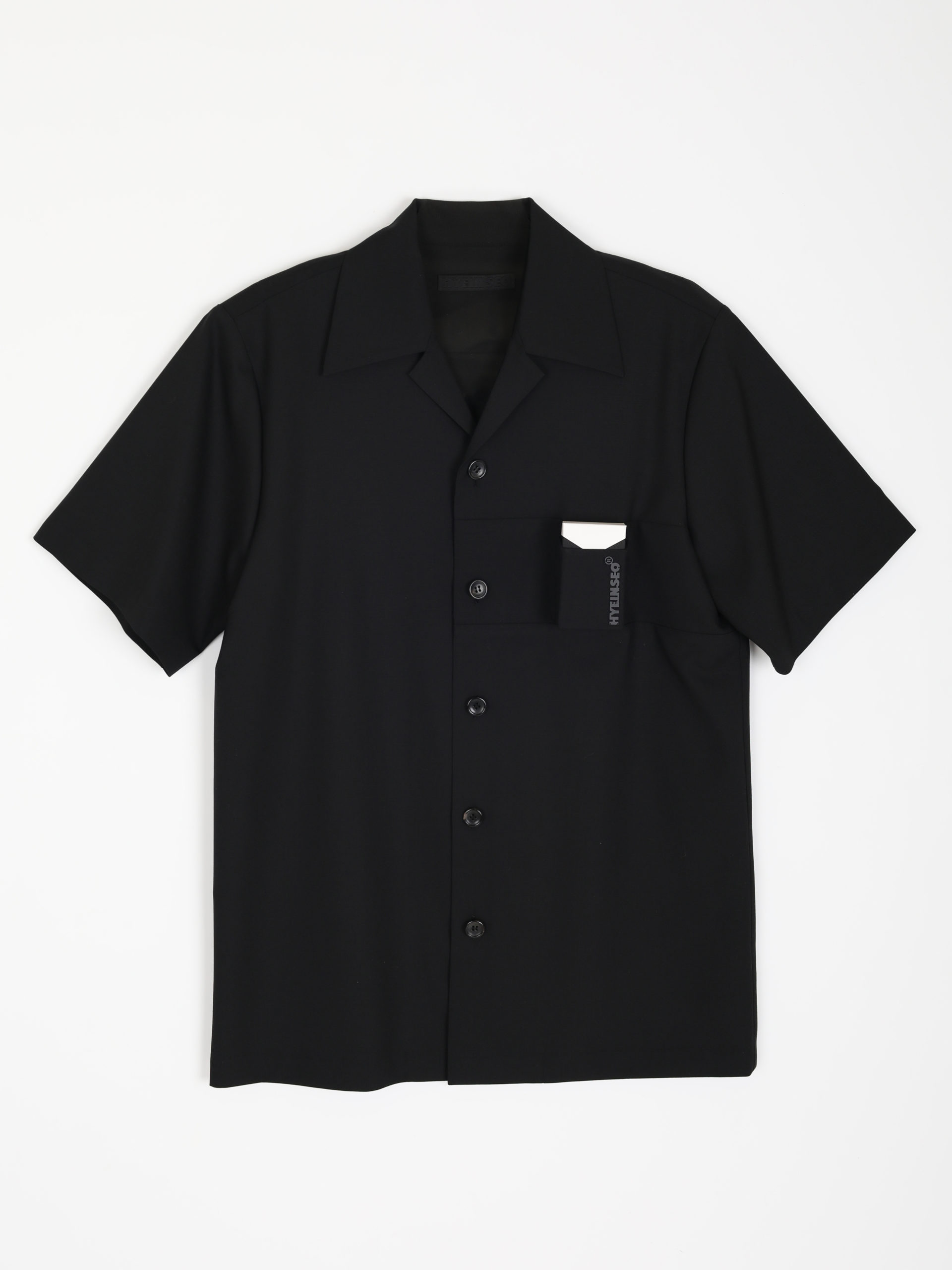 Button down collared shirt with logo hardware cigarette pocket. Packaging includes cigarette case.