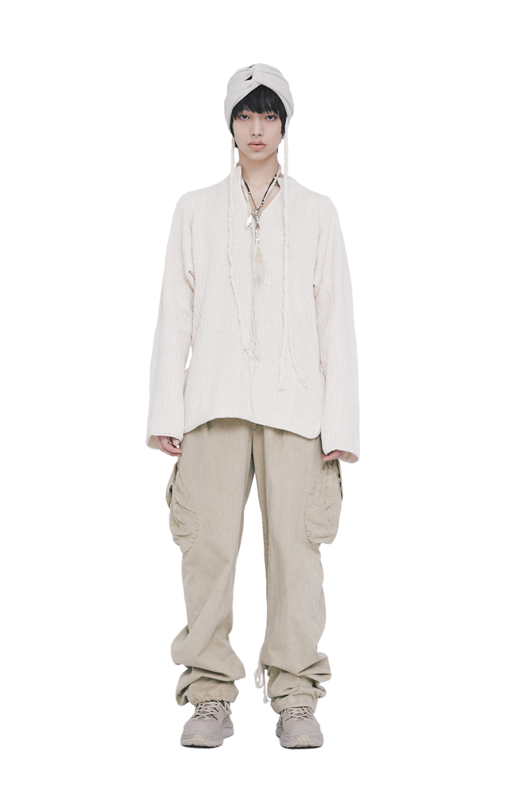 FLAP BUTTON CLOSURE CARGO PANTS, ZIPPERED SIDE POCKETS, LENGTH ADJUSTABLE WITH STRAPS AT BACK.